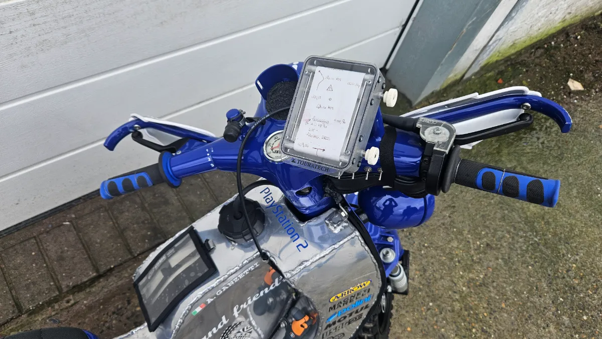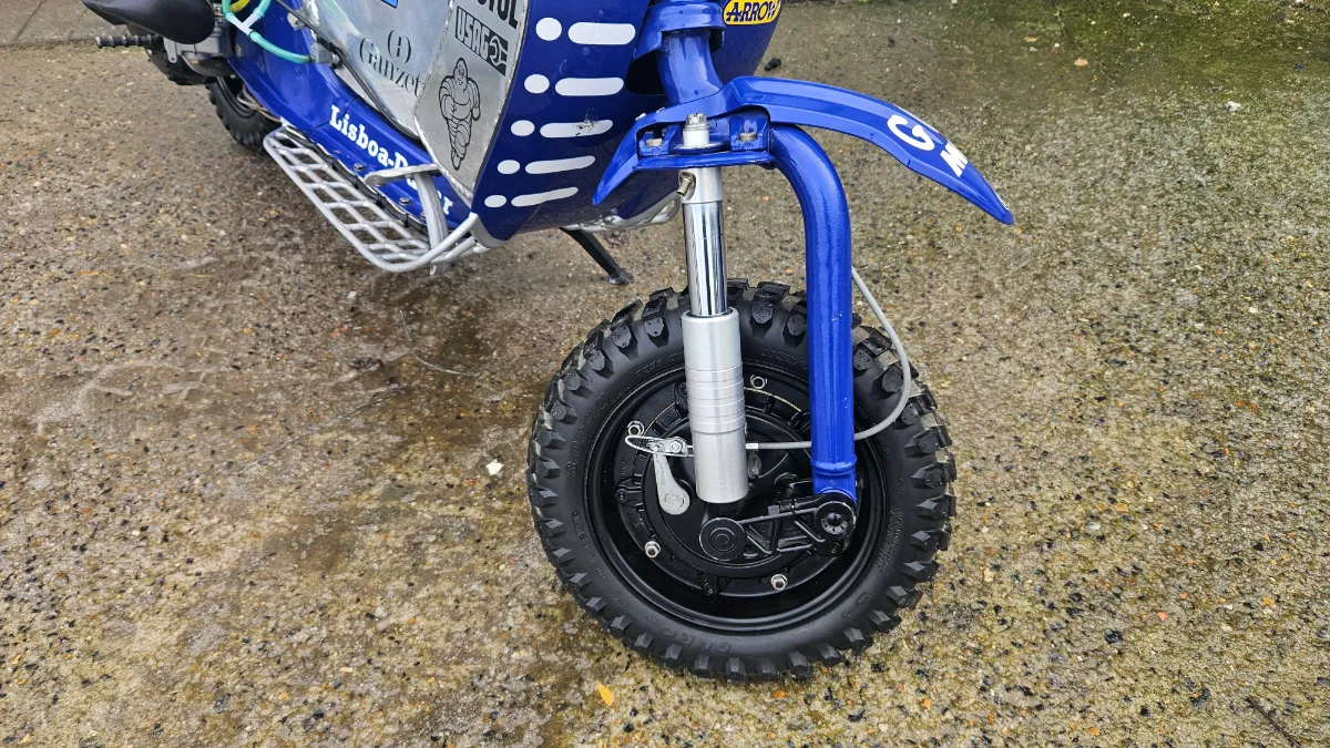 Race tuned motor by Polini with 133cc top end , 20 mm Dellorto Carb, Polini race exhaust , extra strong clutch, swivel kickstart and knobbly tyres.